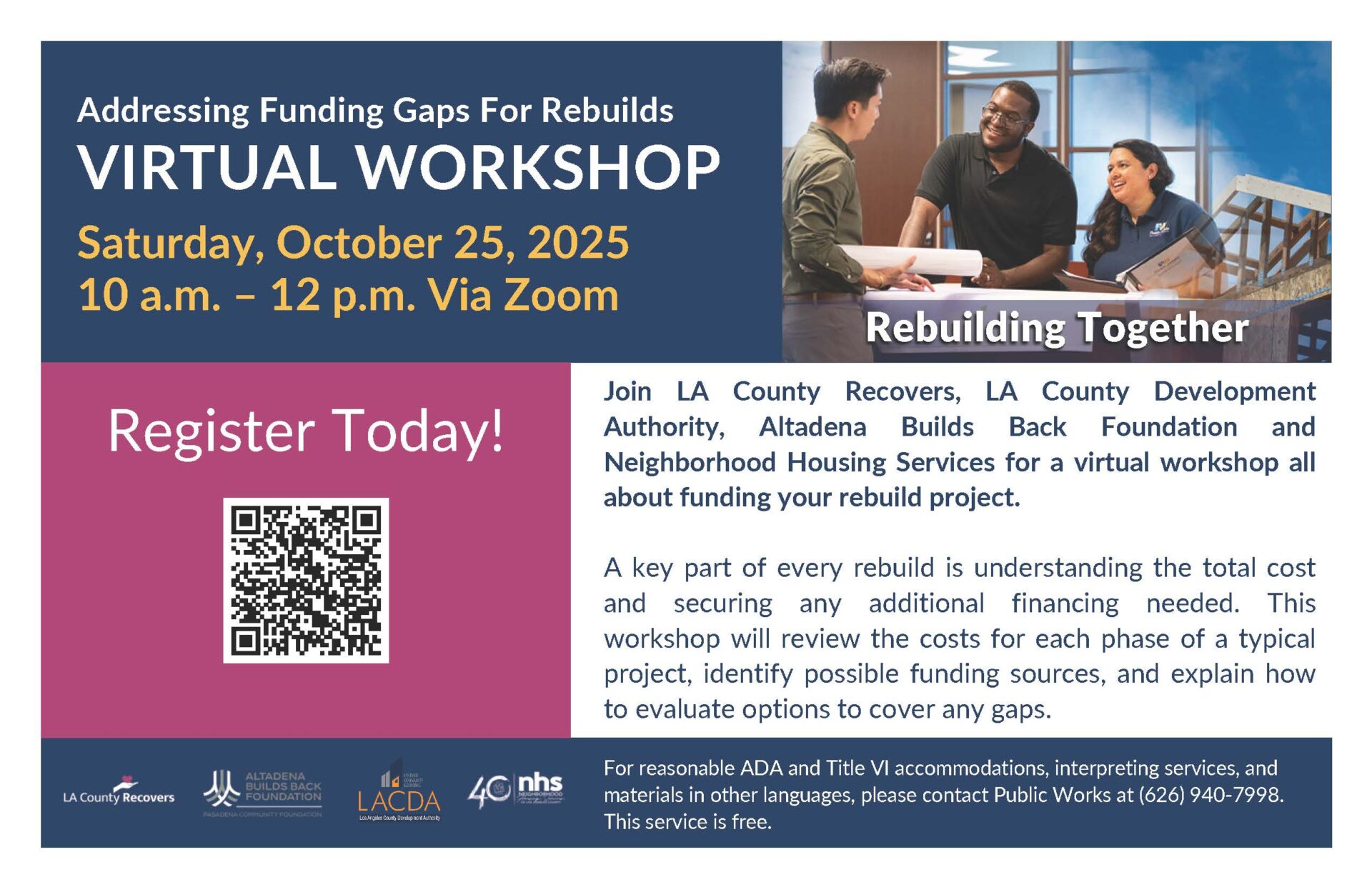 Join LA County Recovers, LA County Development Authority (LACDA), Altadena Builds Back Foundation and Neighborhood Housing Services (NHS) for a virtual workshop all about funding your rebuild project. A key part of every rebuild is understanding the total cost and securing any additional financing needed. This workshop will review the costs for each phase of a typical project, identify possible funding sources, and explain how to evaluate options to cover any gaps.